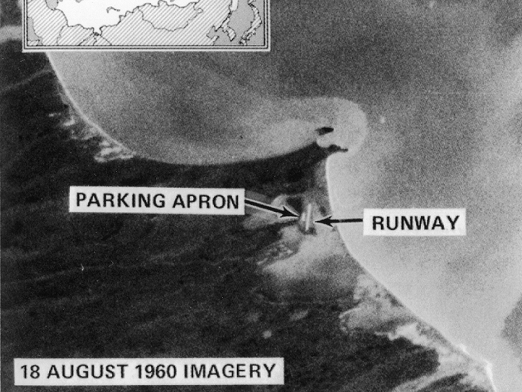 Some of the first images taken by CORONA captured Mys Shmidta Air Field in Chukotka, Russia — an Arctic staging base for Soviet bomber flights.