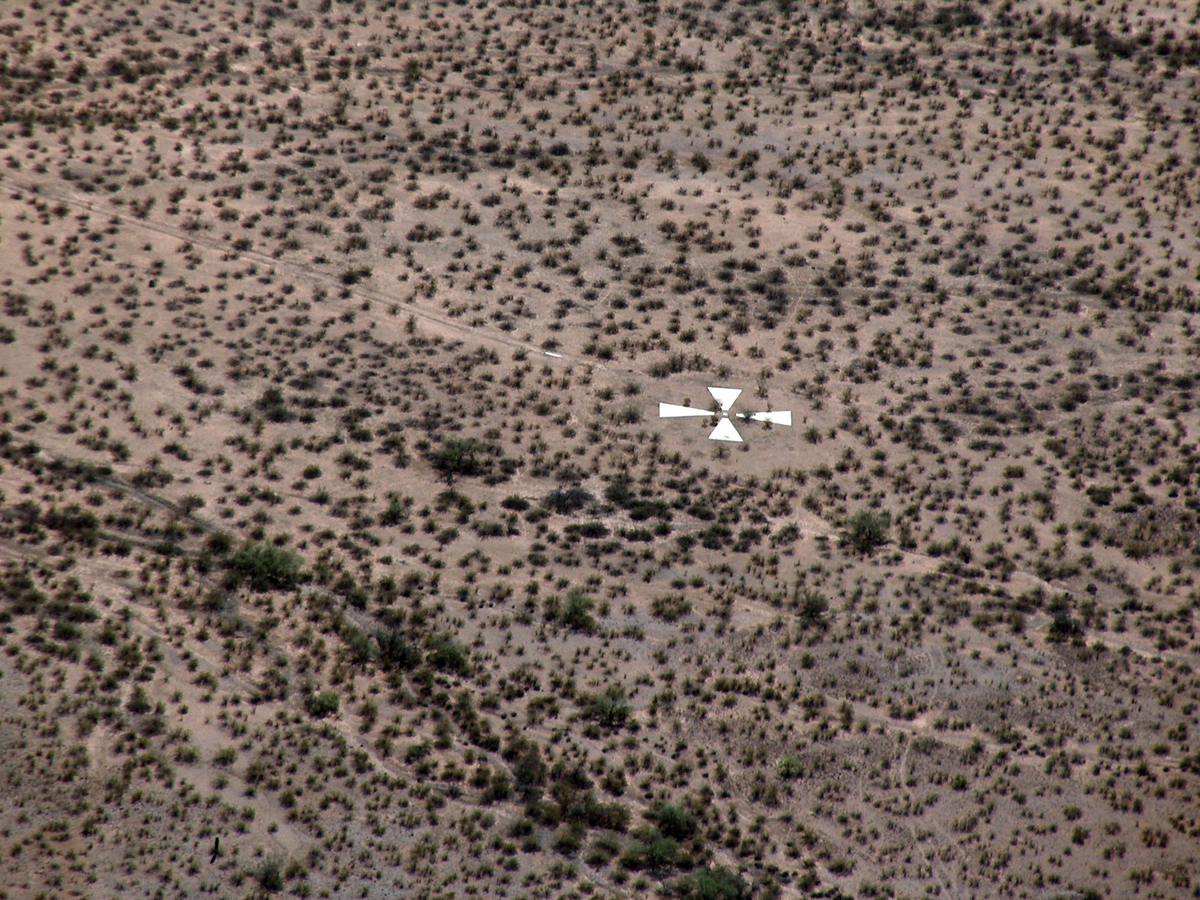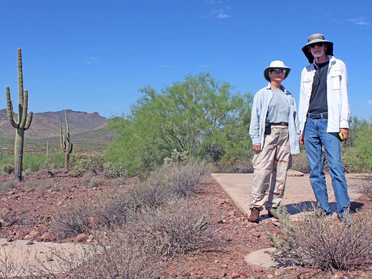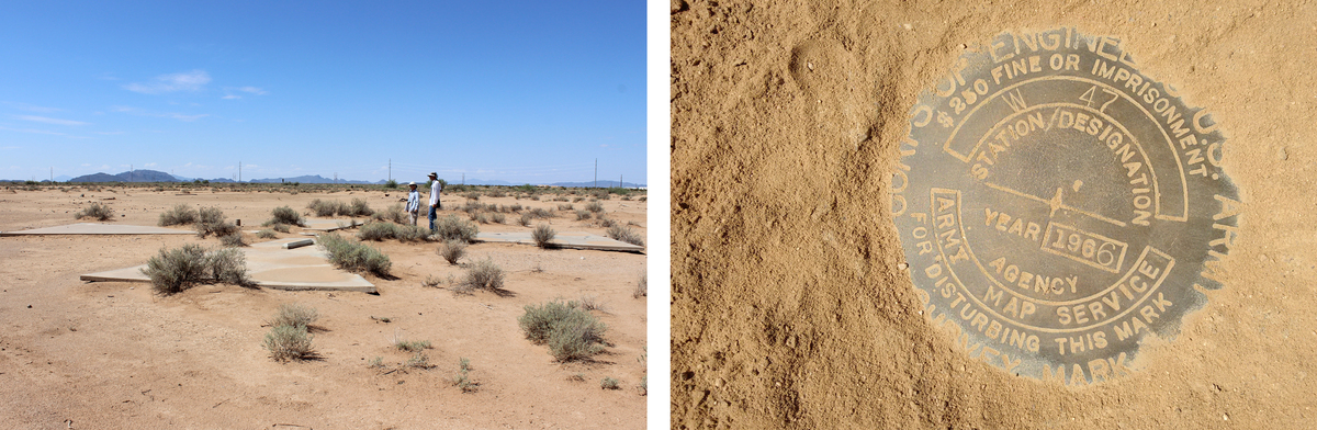 Pez Owen and Chuck Penson inspect a concrete "X" in Casa Grande, Ariz. This marker is located just outside a rural neighborhood.