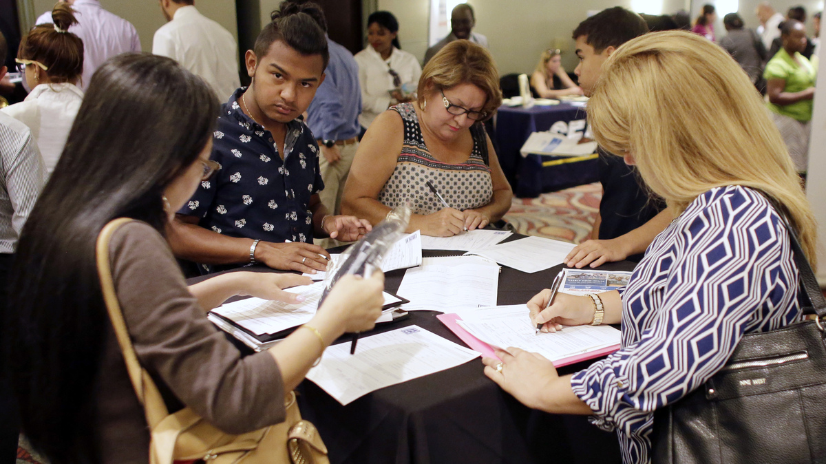People fill out applications at a job fair in Miami Lakes, Fla., in July. The presidential candidates will be watching Friday's monthly Labor Department report for talking points on the unemployment rate and new jobs.