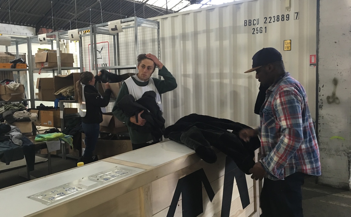 A recently arrived migrant (right) receives clothes at Paris welcome center for migrants that opened earlier this month. They can stay for up to 10 days, but are then moved to migrant centers around the country.
