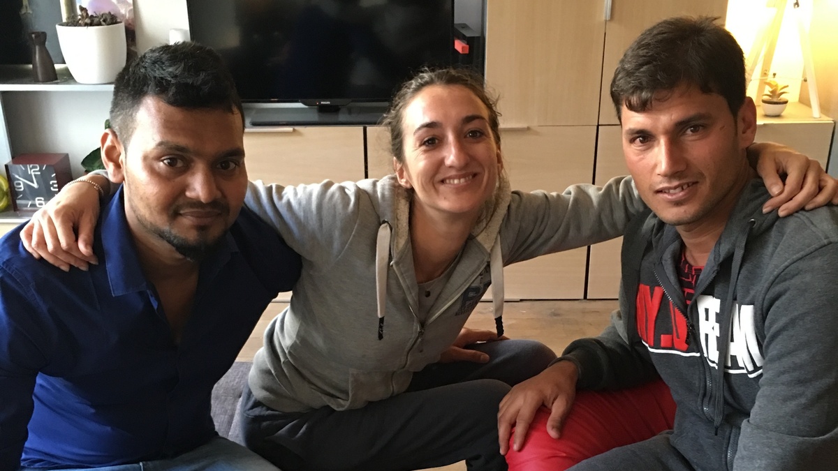 Marion Chabrel (center), 37, has taken in two migrants as roommates, Brahim (left), from Bangladesh, and Shabada (right) from Afghanistan.