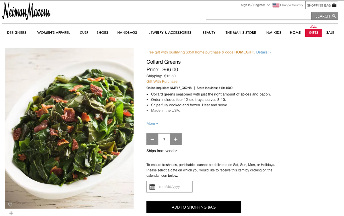 But a different kind of item is now raising eyebrows: The department store is selling collard greens for $66, plus $15.50 in shipping. It advertises that the vegetable is "seasoned with just the right amount of spices and bacon" and "ships fully cooked and frozen."