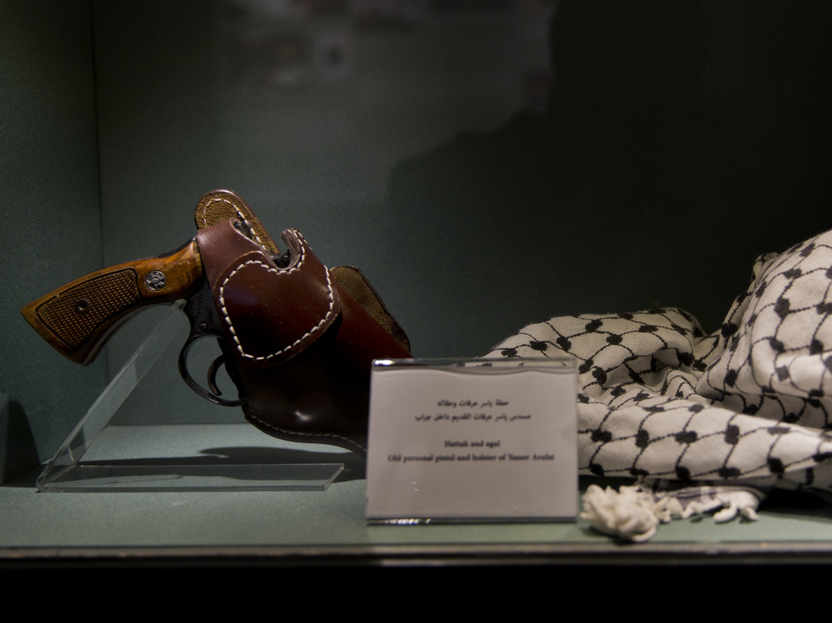 Personal items that belonged to Yasser Arafat, including his pistol and keffiyeh, are displayed in the museum.