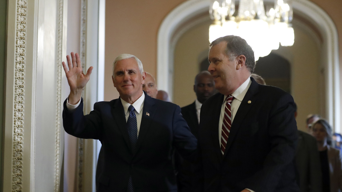 Vice President-elect Mike Pence (left) waves as he departs after a meeting with Senate Majority Leader Mitch McConnell on Thursday. Alex Brandon/AP hide caption