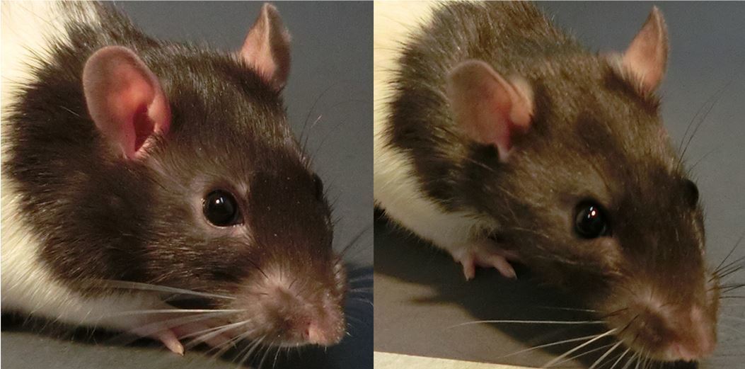 Researchers found that rats experiencing positive emotions had an increased pinkish hue on their ears, like the animal on the left. The animal on the right is from the control group.
