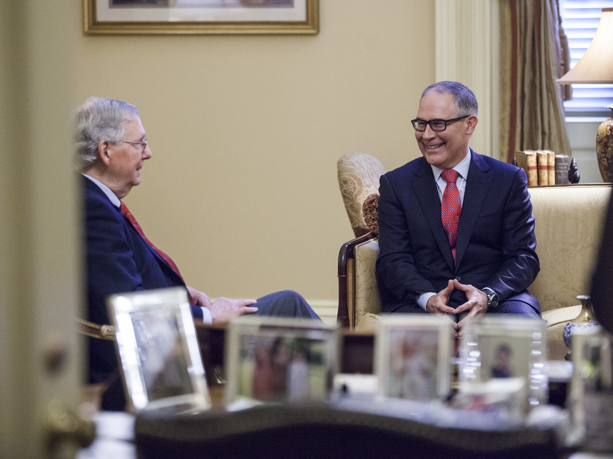 Senate Majority Leader Mitch McConnell, R-Ky., meets Jan. 6 with Environmental Protection Agency Administrator-designate Scott Pruitt, right, on Capitol Hill in Washington, D.C. Pruitt's confirmation hearing is scheduled for 10 a.m. ET on Wednesday. Zach Gibson/AP hide caption