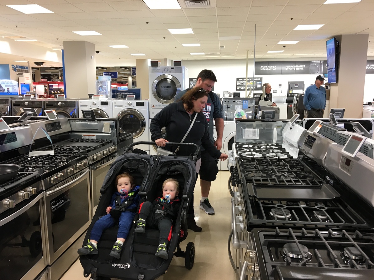 Carla and Jeremy Lang push their twin 18-month-old sons in a stroller while looking at ovens and stoves at a Sears northwest of Chicago.